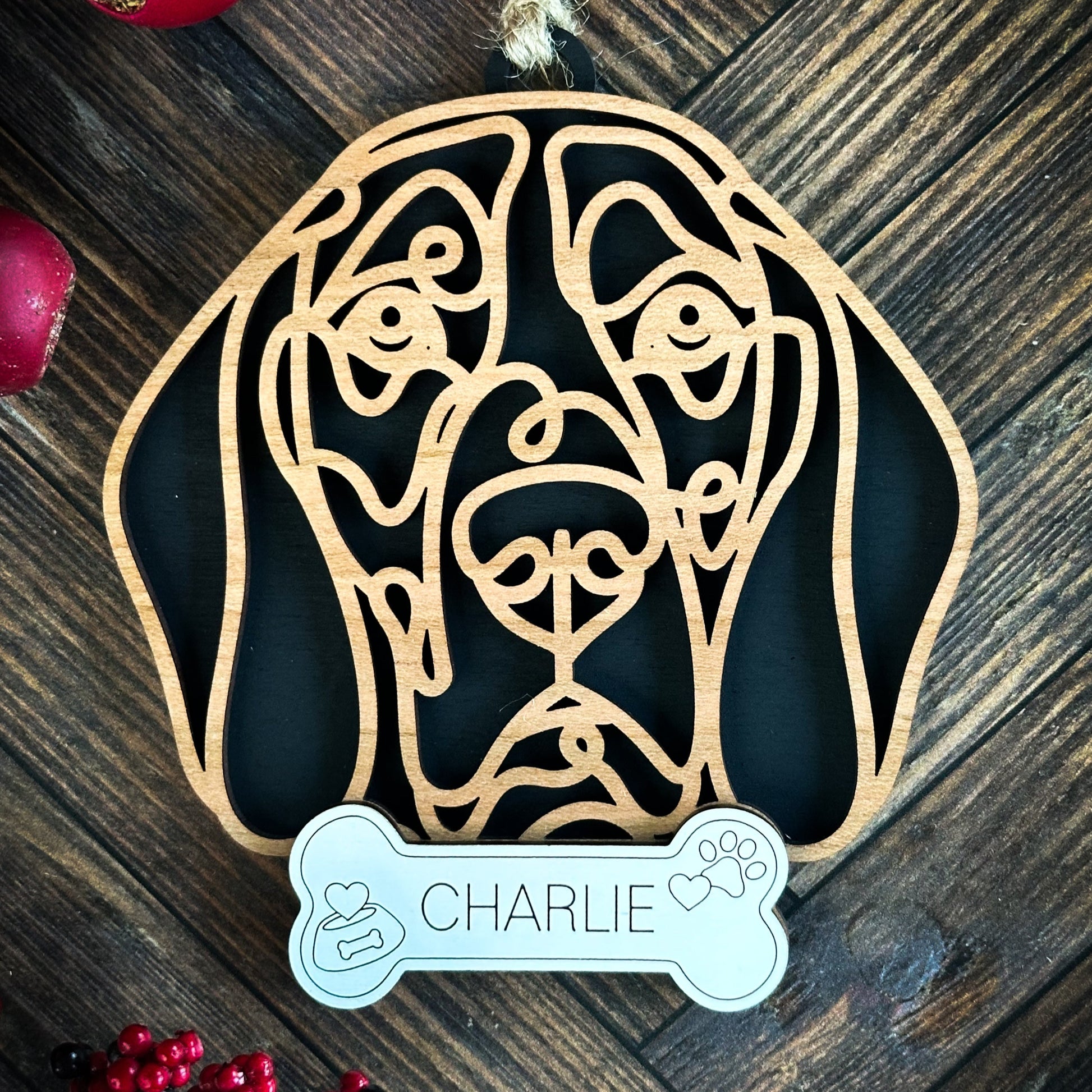 Celebrate your Coonhound with this handcrafted line art dog ornament, designed in elegant laser-cut wood. Measuring approximately 4 x 4 inches, each ornament captures the character of your favorite breed in a modern, minimalist style.