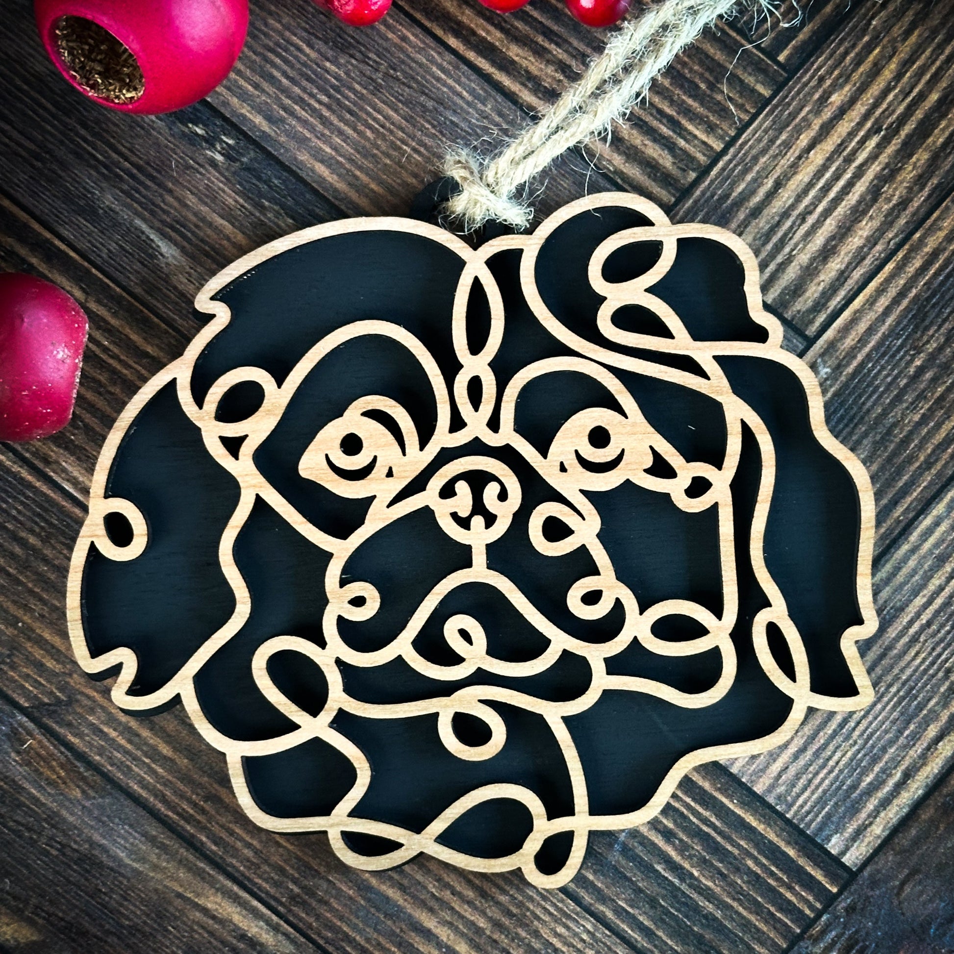 Celebrate your Pekingese with this handcrafted line art dog ornament, designed in elegant laser-cut wood. Measuring approximately 4 x 4 inches, each ornament captures the character of your favorite breed in a modern, minimalist style.