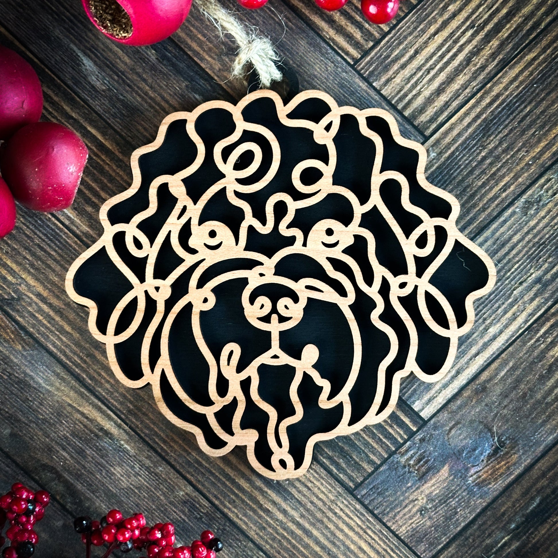 Celebrate your Portuguese Water Dog with this handcrafted line art dog ornament, designed in elegant laser-cut wood. Measuring approximately 4 x 4 inches, each ornament captures the character of your favorite breed in a modern, minimalist style.